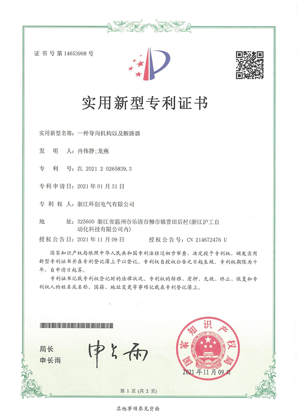 一種導(dǎo)向機(jī)構(gòu)以及斷路器專利證書